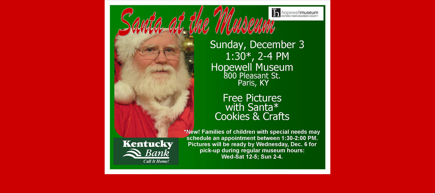 Join us for Santa at the Museum on December 3rd from 2 to 4 p.m. Free pictures with Santa, cookies, & crafts! New! Families of children with special needs may schedule an appointment between 1:30 and 2:00 p.m. See our flyer for more details.