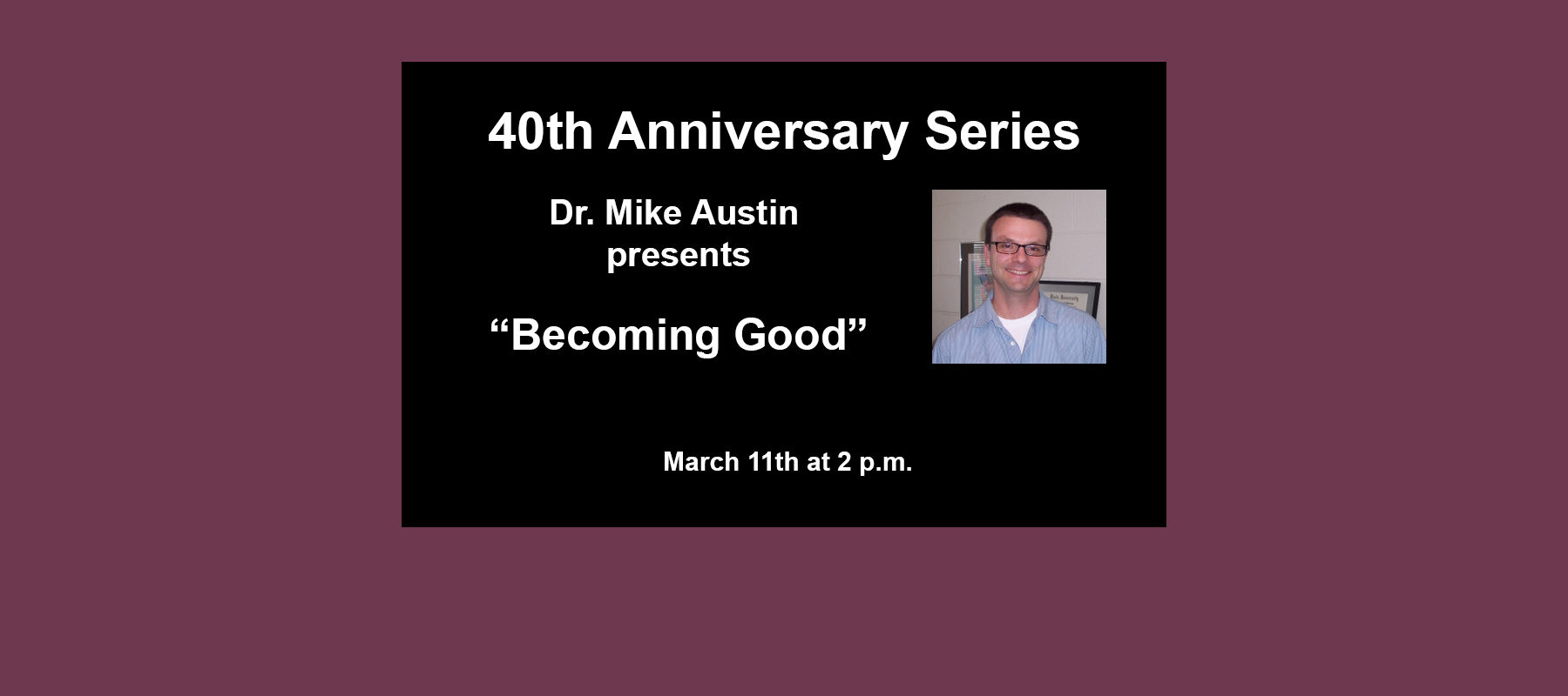 Join us on March 11th at 2 p.m. for the 40th Anniversary Series as Dr. Mike Austin presents “Becoming Good.” This event is free and open to the public. For more details, please see the event page.