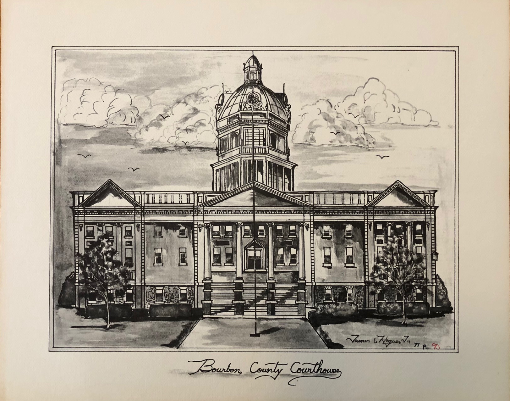 Limited edition print by artist James Hogue, Jr. of Bourbon County’s beautiful courthouse (largely considered the prettiest in Kentucky!). The courthouse was completed in the early 20th Century in the Beaux Arts style.